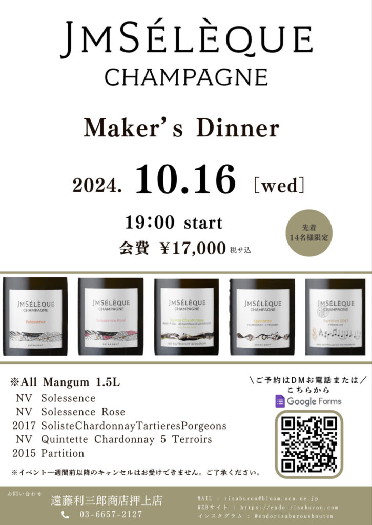 この度、フランス・シャンパーニュのアルチザンの一人、「JM Seleque」当主のジャン・マルク・セレック氏をお招きし、特別なディナーイベントを開催いたします。